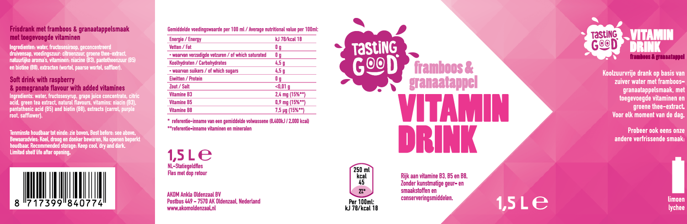 Na het groeiende succes van Tasting Good Vitamin Drink 500ml komt AKOM met Vitamin drink in 1,5L flessen.
